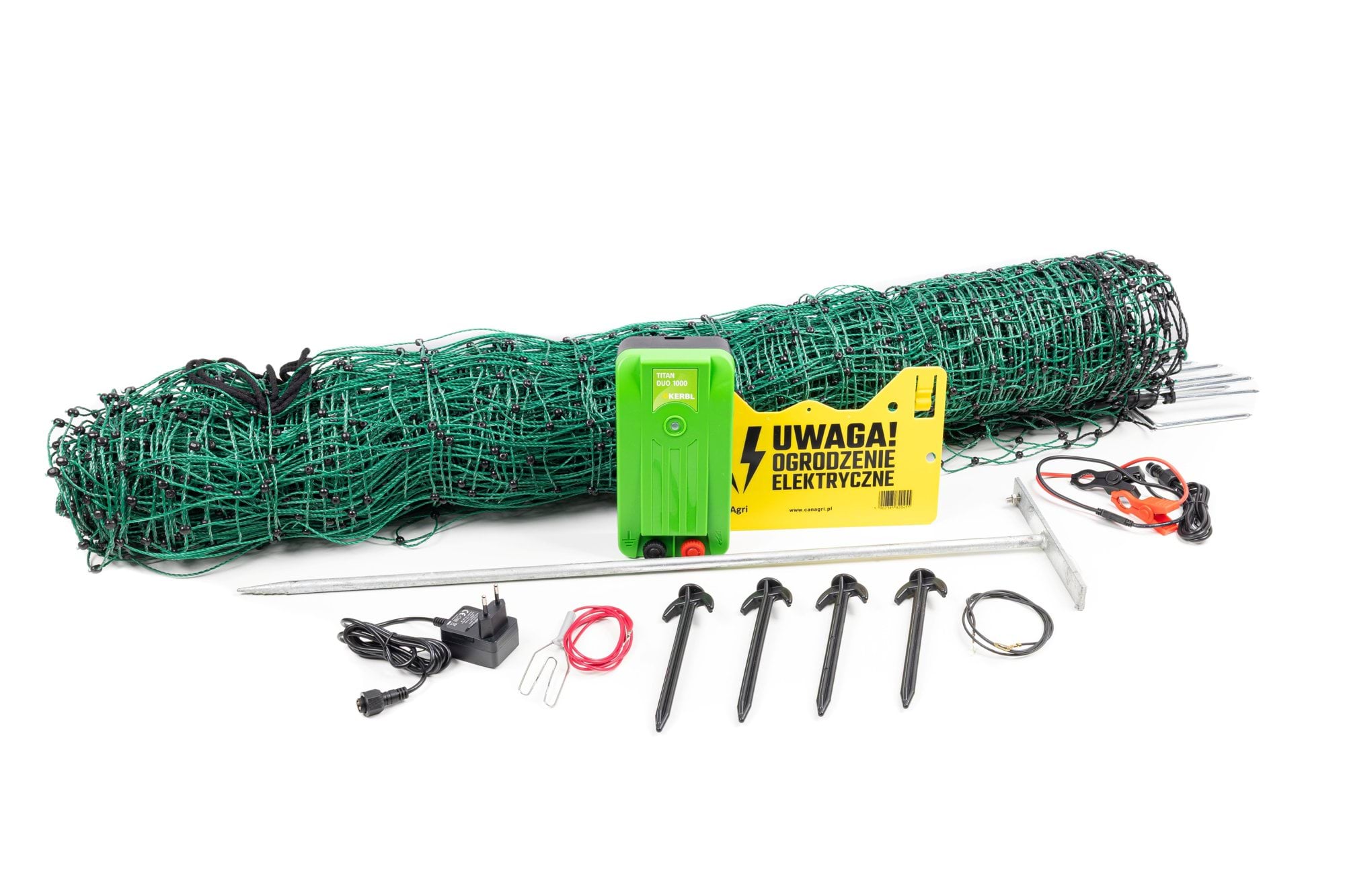 Zestaw obejmuje siatkę na drób zieloną o długości 25 metrów i wysokości 106 cm, podwójne bolce z 3-letnią gwarancją, elektryzator Titan DUO 1000 z zasilaniem uniwersalnym, przewód uziemiający, krokodylkowy zacisk przewodu ogrodzeniowego, pręt uziemiający, zestaw do naprawy siatki oraz znak ostrzegawczy ogrodzenia elektrycznego.