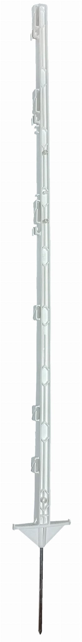 Palik ogrodzeniowy biały, 125 cmz podwójną stopką, posiada liczne zaczepy do linki czy taśmy, dzięki temu można dostosować wysokość i ilość linii do konkretnego zwierzęcia. Pasują do wszystkich konwencjonalnych taśm, plecionek, linek i drutów mocowanych poziomo, wzmocnione dla większej stabilności. Z galwanizowaną sztycą. Stosowany do budowy ogrodzeń elektrycznych dla zwierząt typu: bydło, konie, dzikie zwierzęta.